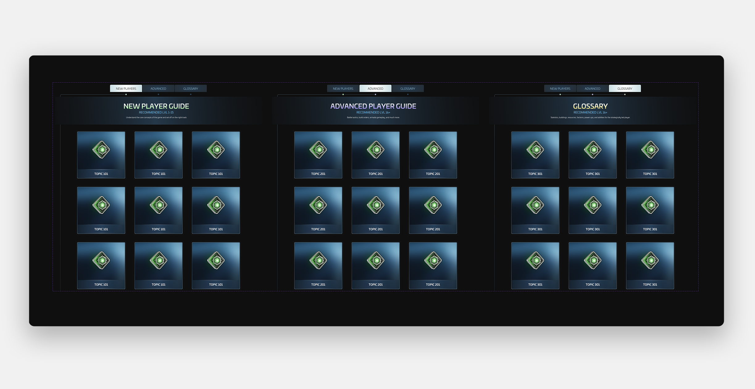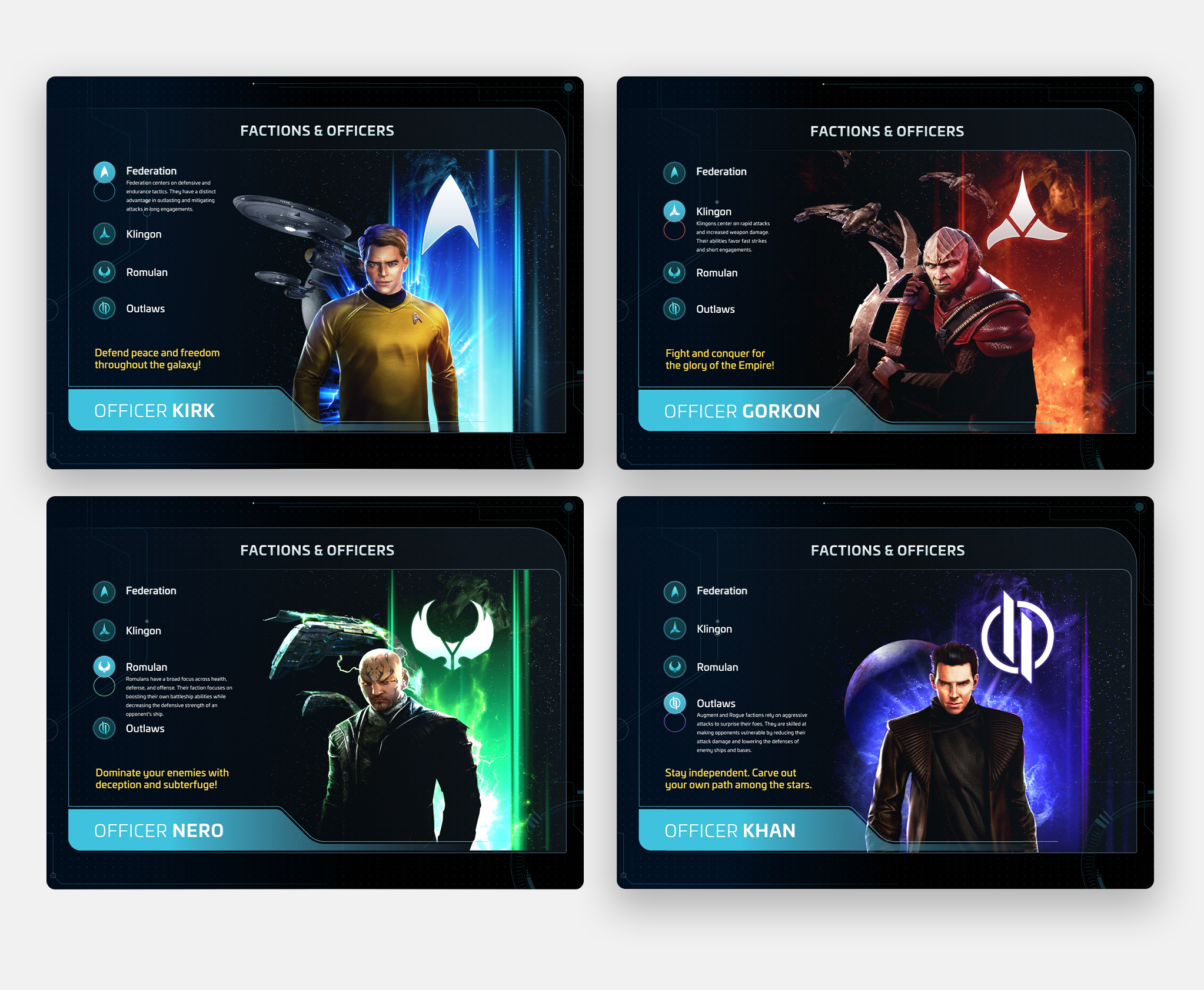 Designs were developed that explored a variety of pages, player resources, and interactive elements. The elements borrowed colors and imagery from in-game and marketing assets, and tied together with holographic UI elements that reflected a contemporary approach to Michael Okuda’s original on-set interactive displays on shows like Star Trek the Next Generation.