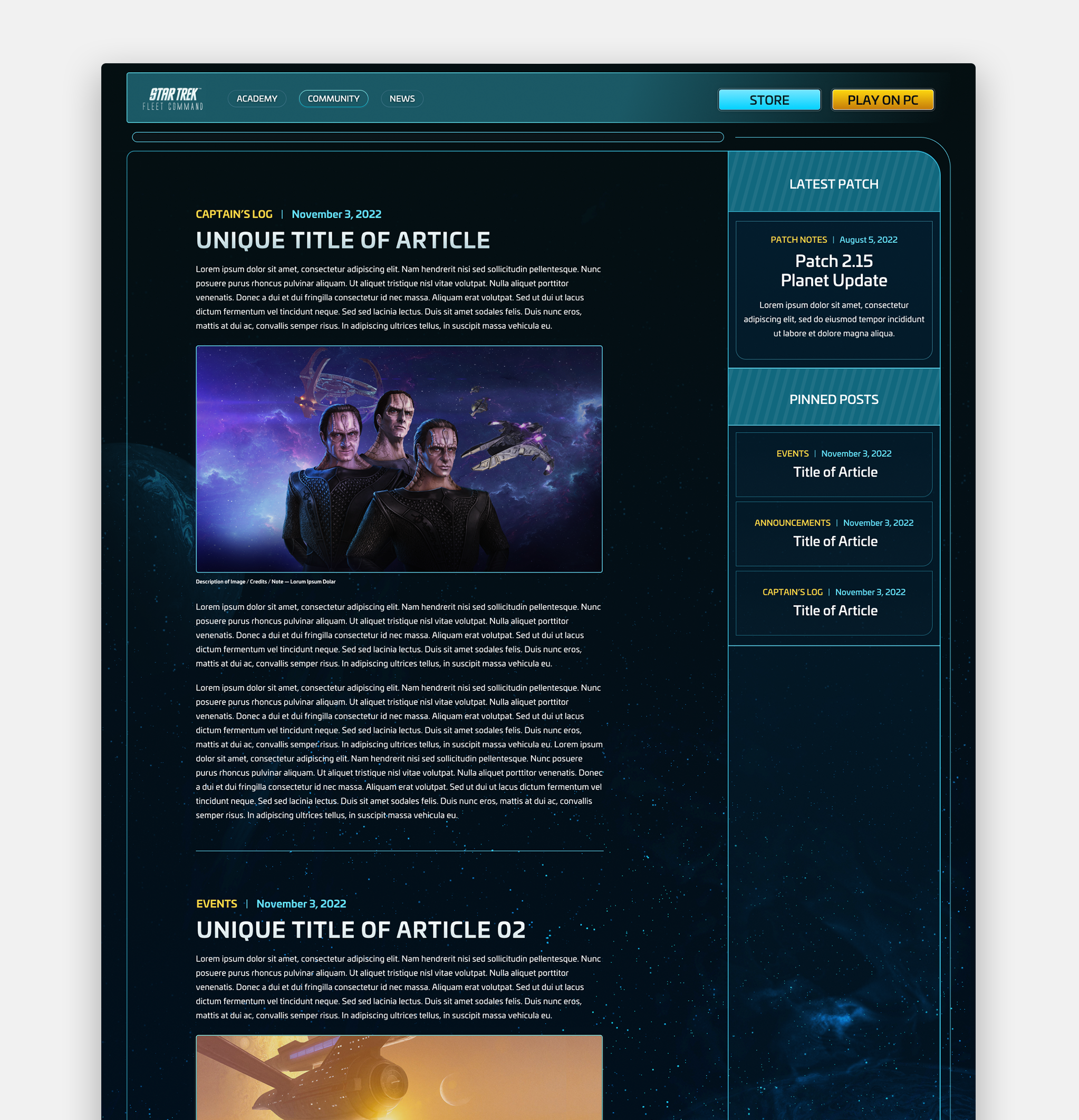 I worked with the Star Trek Fleet Command team and Web Design / Dev team at Marzee Labs to create a variety of pitch assets for the Updated Star Trek Fleet Command website. The goal of the project was to visualize a functional website to be put into development and offer some visual conceptual themes.